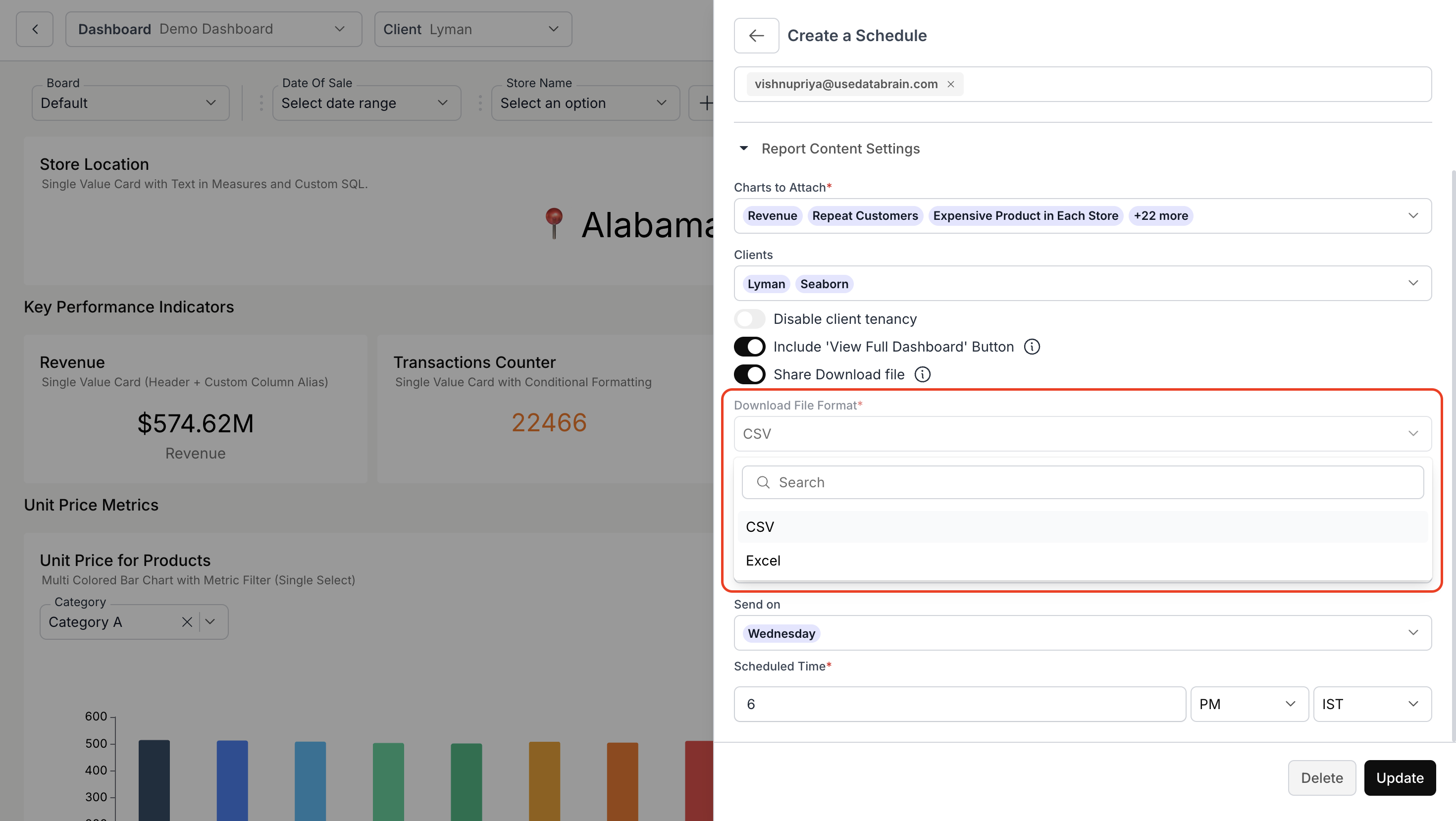 - Schedule Report in Embed: Scheduling reports through embedded dashboards now works contextually based on the selected dashboard and client.
