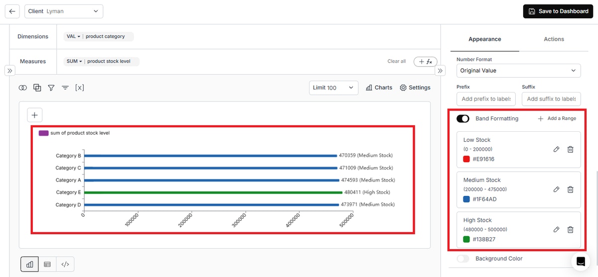 - Conditional Band Formatting for Horizontal Bar Chart: Allows users to apply custom band colors based on defined ranges, enhancing visual clarity.
