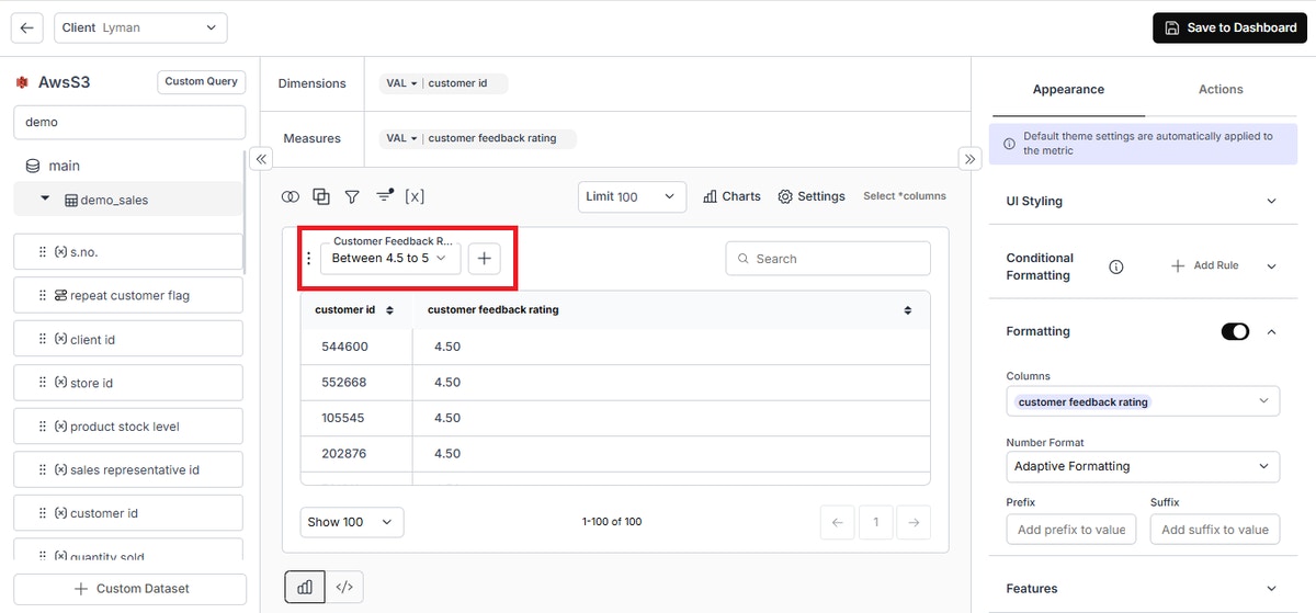 - Clear All Option: Easily clear all columns added in measures or dimensions with a single click using the “Clear All” functionality.