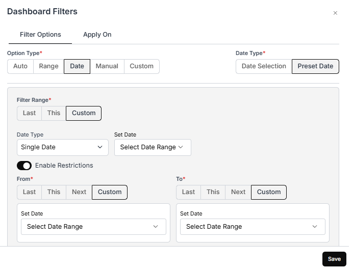 - Date Restriction Feature in Preset Date Dashboard Filters: We have added an “Enable Restrictions” toggle to the Preset Date Dashboard filter, similar to the Metric Filter.
