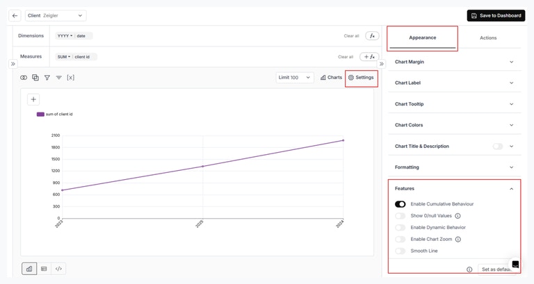 - Cumulative Option for Line and Area Charts: A new “Cumulative” option has been added to Line and Area charts, accessible under Chart Settings > Appearance > Features > Cumulative for better trend analysis.
