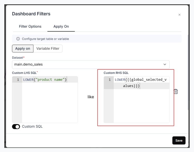 - Add RHS Custom SQL Support: Added the ability to control how selected options from a dashboard dropdown are applied on the RHS of the