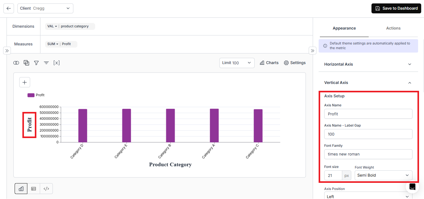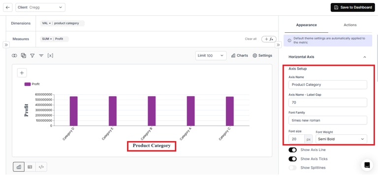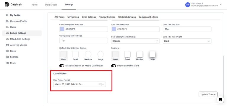 - Chart settings for chart title, axis labels, axis values, and legend have been added globally under the ‘UI Theming’ section on the Embed Settings page.