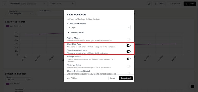 - Added options in preview link: Users can now control the side panel and dashboard name in the preview link generation
