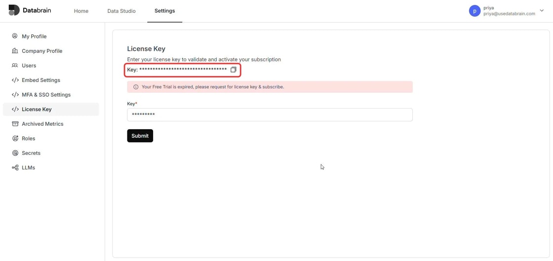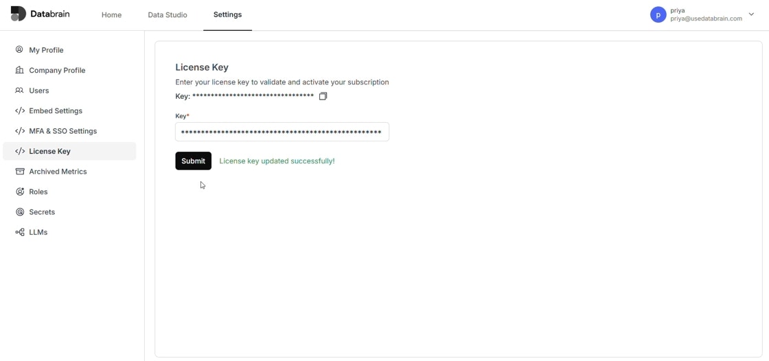 - Enter License Key: Paste your license key in the designated field and click ‘Submit’.