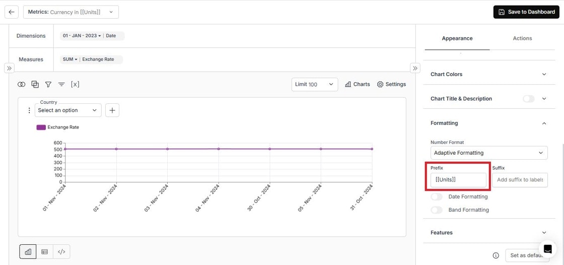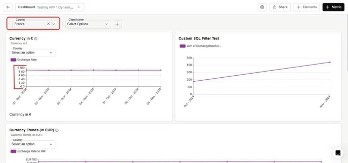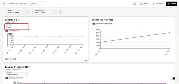 dynamic property updates the currency unit based on the selected country in the dashboard filter.