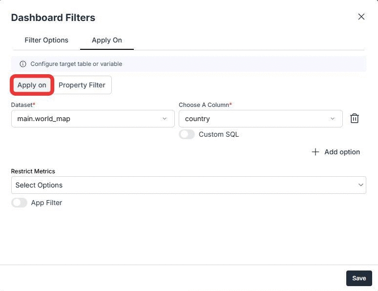 Functioning of Variable Apply On method available in Dashboard Filters.