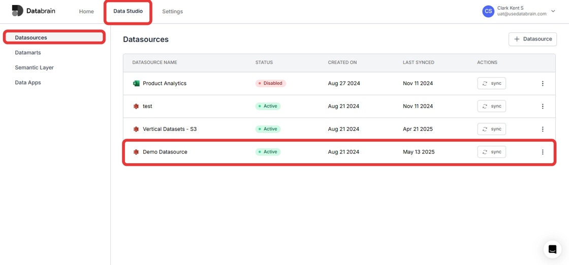 - Navigate to the “Data Studio” tab in the top menu and click on “Datasources” in the left sidebar.