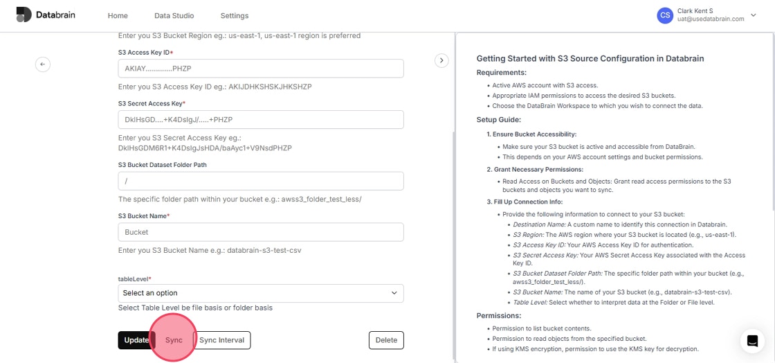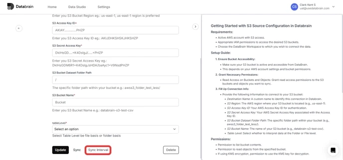 If you are using the AWS3 data source, click the “Sync Interval” button and specify the time duration to automatically sync your files.