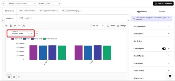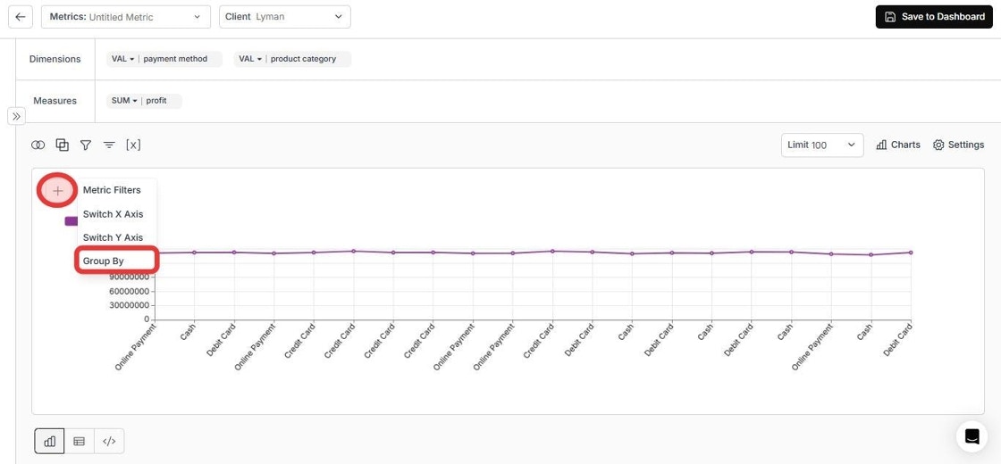 Click the ”+” icon at the top of the metric and select the “Group By” button.