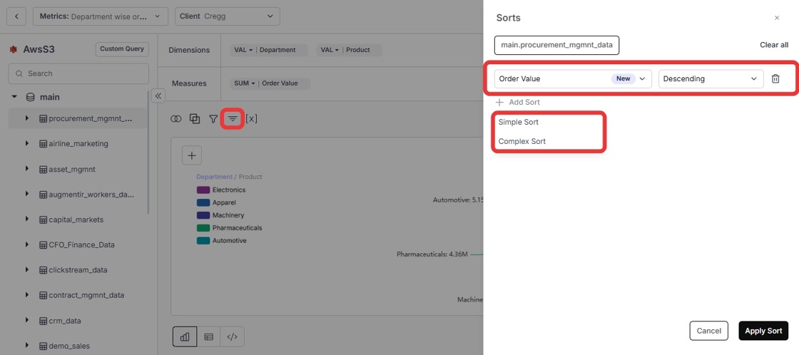 - In addition to the lexicographical order provided by SQL, you can sort the chart in any desired order using “Complex Sort” with custom SQL.