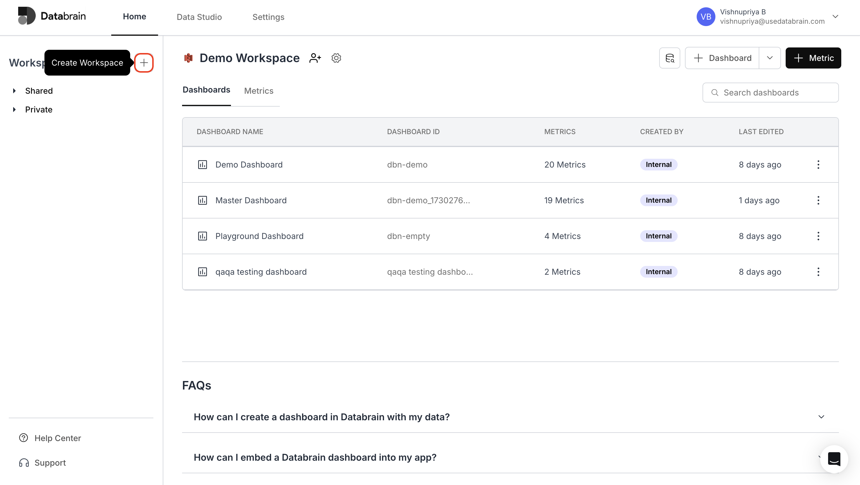 On the Home page, click the + button located near the Workspaces drop-down menu.