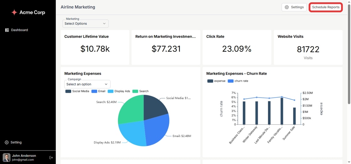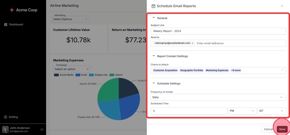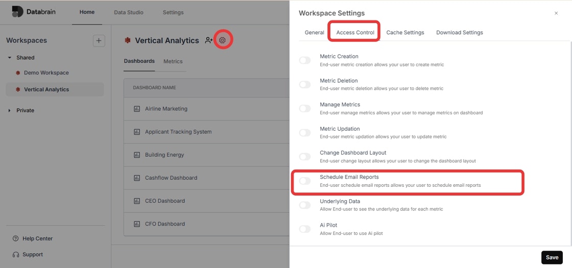 - In the “Access Control” section, enable the toggle “Schedule Email Reports” and click on “Save”.