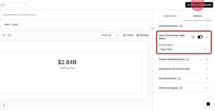 - Then, toggle on the Chart Click Actions with Metric option.