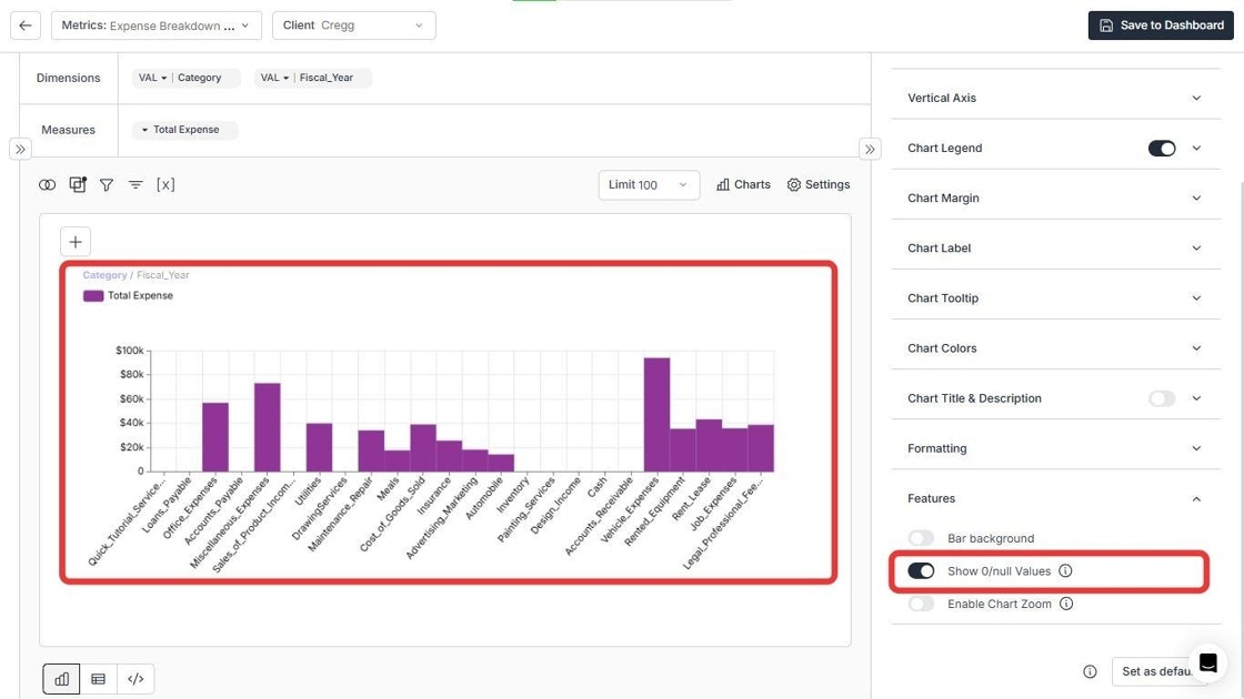 Let us take a bar chart showing Total Expense by Category. Toggle off “Show 0/null Values” to hide categories with no expenses, making the chart cleaner and focused on actual data.