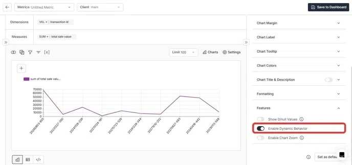 Let us take a line chart showing total sale value over time. When you toggle ON “Enable Dynamic Behavior”, the chart dynamically updates to reflect changes in the displayed data, providing a more interactive and adaptable view of the trends.