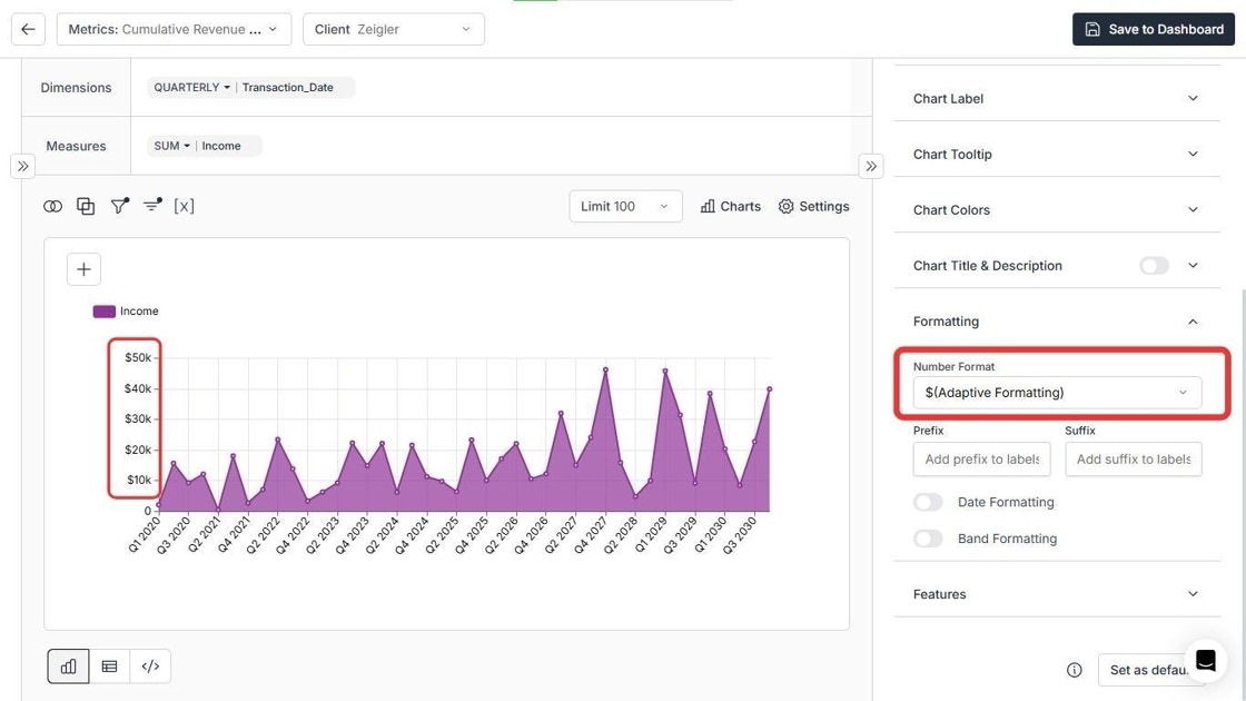 Set: Number formatting, and add prefixes or suffixes to value labels. Use Case:Let us take an area chart showing Income. Format values with a preferred number format and add prefix/suffix to make data more readable.