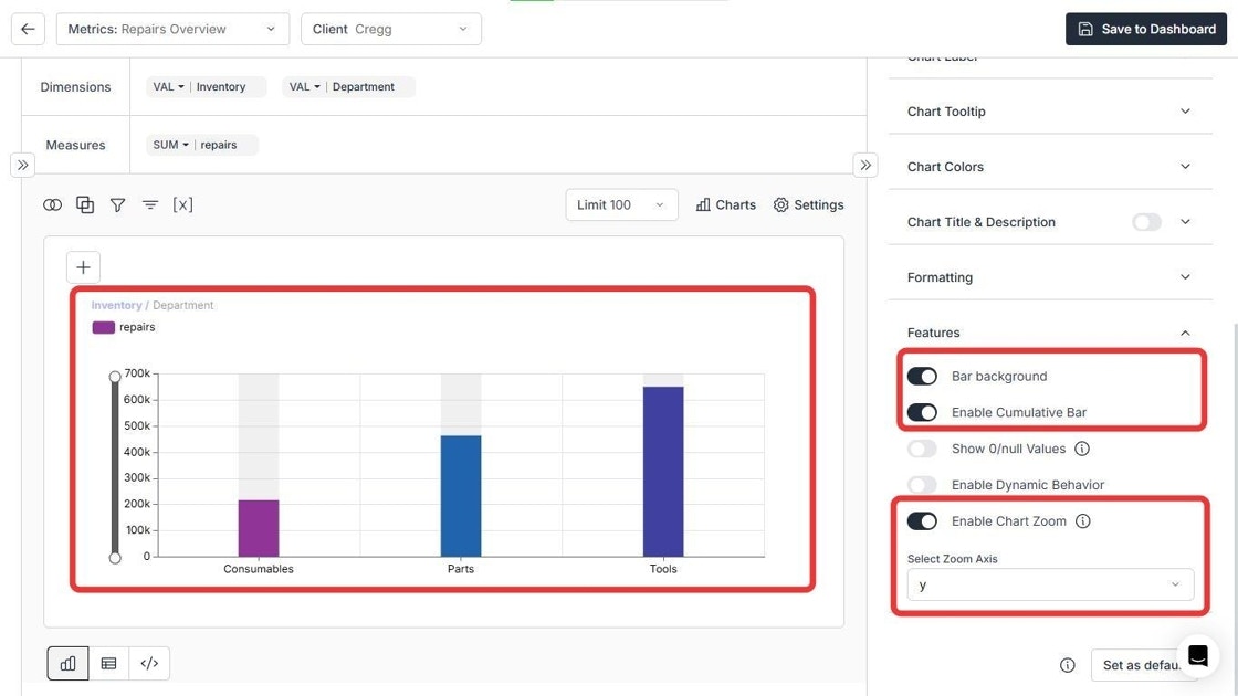 Let us take a bar chart showing repairs by inventory. Enable features like: