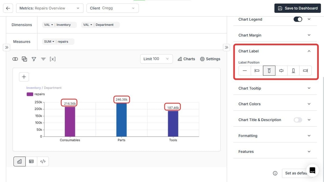 Position: Determine where value labels appear on the chart. Use Case:Let us take a bar chart showing repairs by inventory. When you select a label position, values can appear inside, above, center, left, or right of the bars, enhancing data readability. The values are now clearly visible in your preferred position, making data reading more convenient.