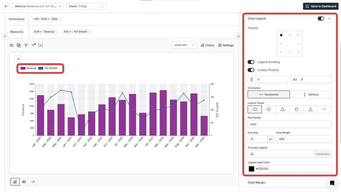 Customize: Display, appearance, position, truncation, and shape. Use Case: Let us take a combo multi-scales chart showing Revenue (purple bars) and YoY Growth (blue line).When you customize the Chart Legend, you can configure: