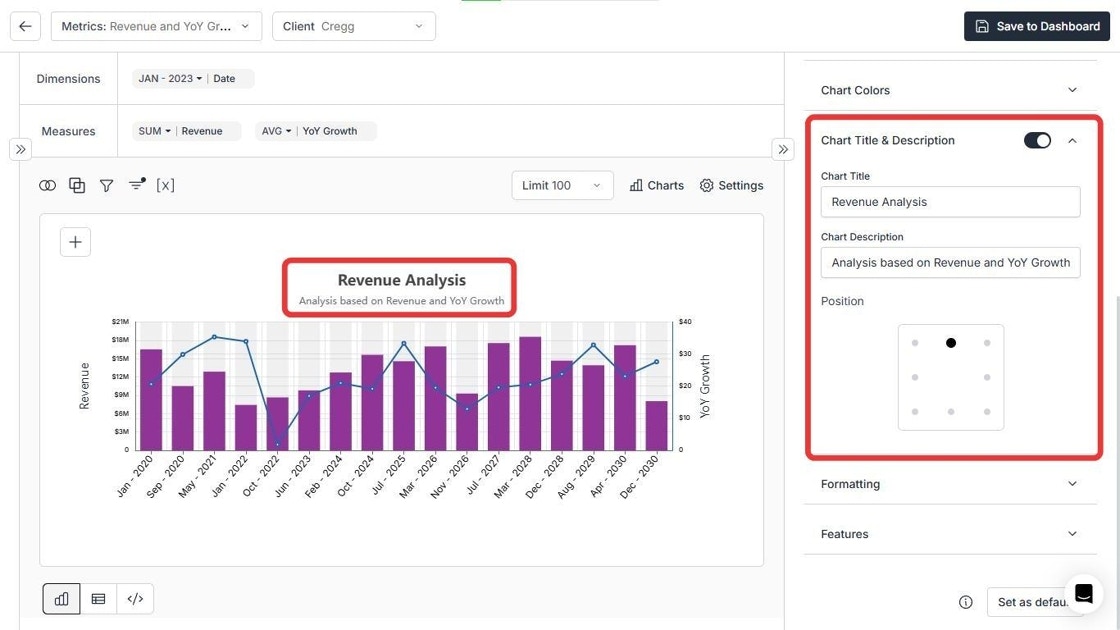 Add: Titles and descriptions, and adjust their positions. Use Case:Let us take a combo chart showing Revenue and YoY Growth. Add suitable title and description, and adjust their position to make the chart’s purpose instantly clear.
