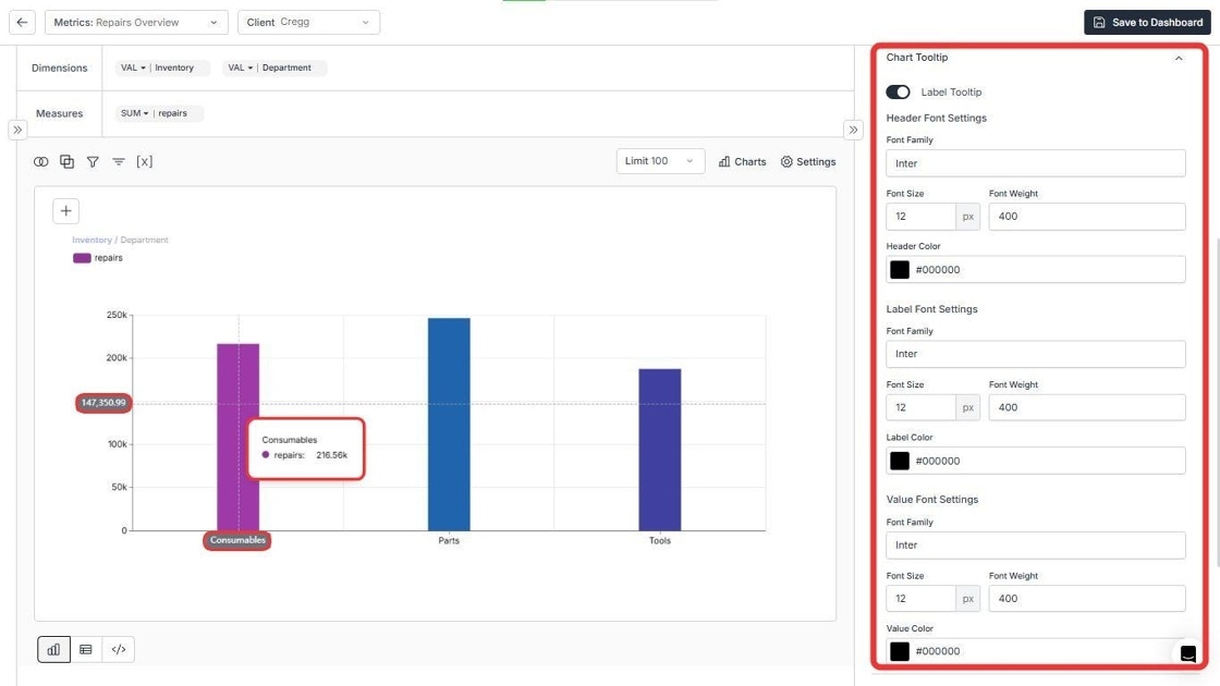 Adjust: Font and color for Header, Label, and Value. Use Case:Let us take a bar chart showing repairs by inventory. When you hover over a bar, customize the tooltip’s header, label, and value appearance by adjusting their fonts and colors for better readability.